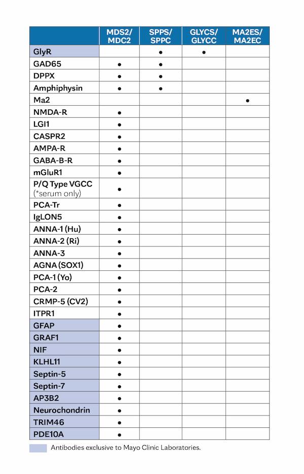 - Includes several antibodies found only at Mayo Clinic Laboratories: Septin 5, Septin 7, and TRIM46.